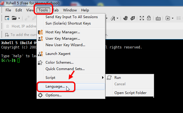 1、xshell安裝好之後,默認就是英文的。怎麼設置為中文?作者告訴你,打開xshell菜單欄,找到語音 languagle菜單